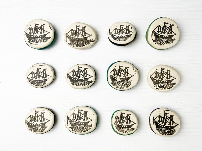 Approximately 1-1.5" x 1.25-1.5", printed on the back with a masted ship. Comes in a stamped muslin bag for popping in your purse or bag. A wonderful little object if you are prone to fidgeting.