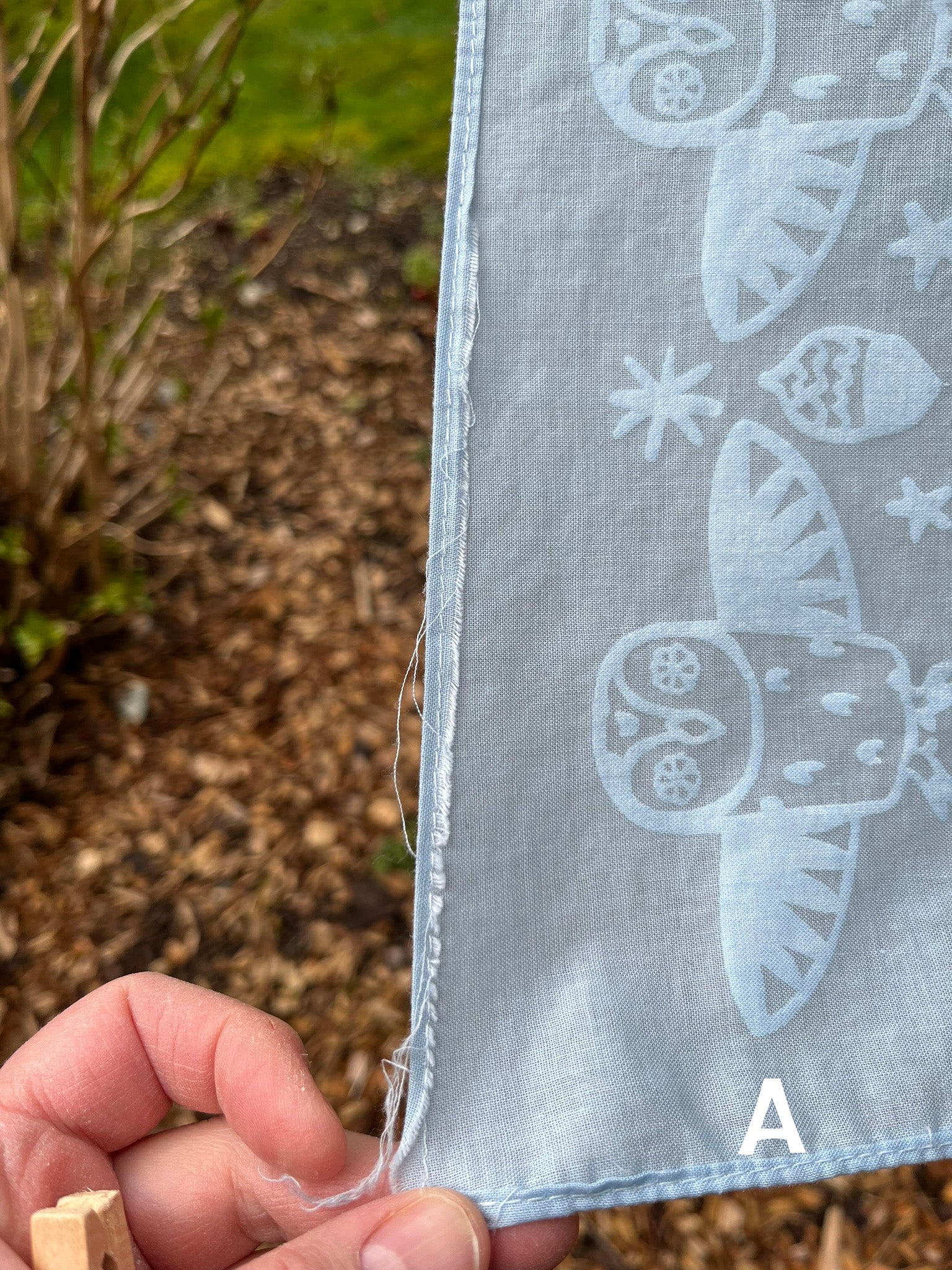 Please note, there may be small variances due to the nature of handmade goods. We do not consider these "seconds" but do point out any imperfections and price accordingly. All the blue bandanas have some issues with the rolled hemming. Please see the photos.