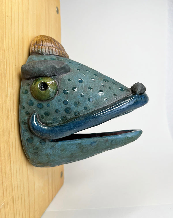 Hand-sculpted friendly stoneware fish-head to pop on your wall wherever you need to see a friendly face! Hanging hole is built into back. Please don't over-tighten wall screw.