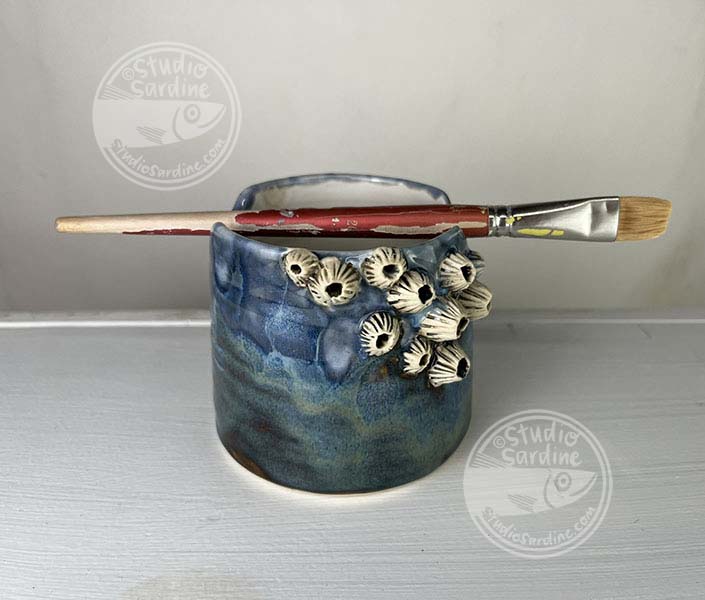 Large, hand-sculpted, barnacles adorn this unusual piece. Intended for watercolor brushes but could be used as a small bowl. 3.45" tall, 3.8" wide