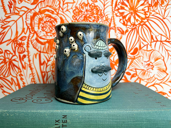 3D salty sailors with stunning eyebrows occupy both sides of this handmade porcelain mug! The barnacles are hand-sculpted porcelain (no barnacles were harmed in the making of this mug!).
