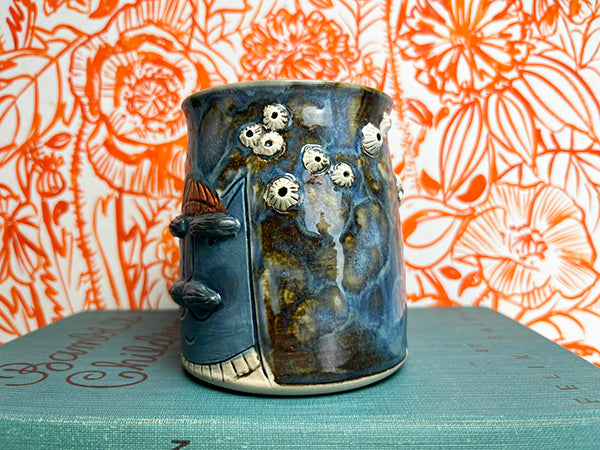 3D salty sailors with stunning eyebrows occupy both sides of this handmade porcelain mug! The barnacles are hand-sculpted porcelain (no barnacles were harmed in the making of this mug!).