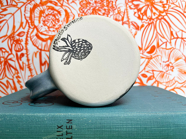Two cheeky kitties have been carved on the sides of this handmade porcelain mug. Hand-stamped and painted.