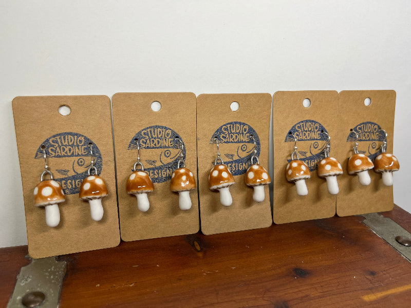 Studio Sardine Tiny porcelain toadstool mushroom earrings caramel brown